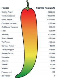 Le piment de cayenne est une petite force de 30 000 à 60 000 à l'échelle de Scoville. Base de plusieurs sauces grâce à sa coloration caractéristique.