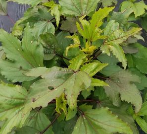 Variété à feuilles en forme d'érable bordeaux profondes (3-5 pieds) avec des bords dentelés, tolérantes à la sécheresse et à la chaleur et dont la coloration apporte ses lettres de noblesse au bissap.